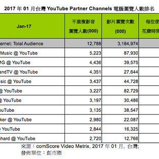 comScore與創市際公佈2017年1月台灣網路影音流量報告